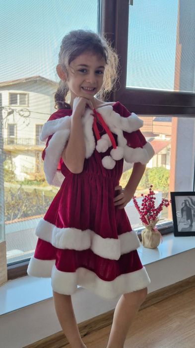 Inchiriere rochie craciunita 598Rochita este realizata din tul cristal si saten. Contine si caciulita din catifea si blanita. Pret inchiriere 60 lei. La ridicarea costumului se achita o garantie returnabila de 150 lei.