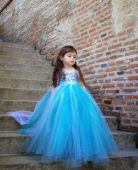 Inchiriere rochita Elsa 924Celebra printesa Elsa din Regatul de gheata superba in nuante de albastru cu strasuri si o trena lunga stralucitoare. Rochita este realizata din tul cristal fasii late pe multe straturi, top crosetat in partea de sus cu detalii argintii si strasuri.